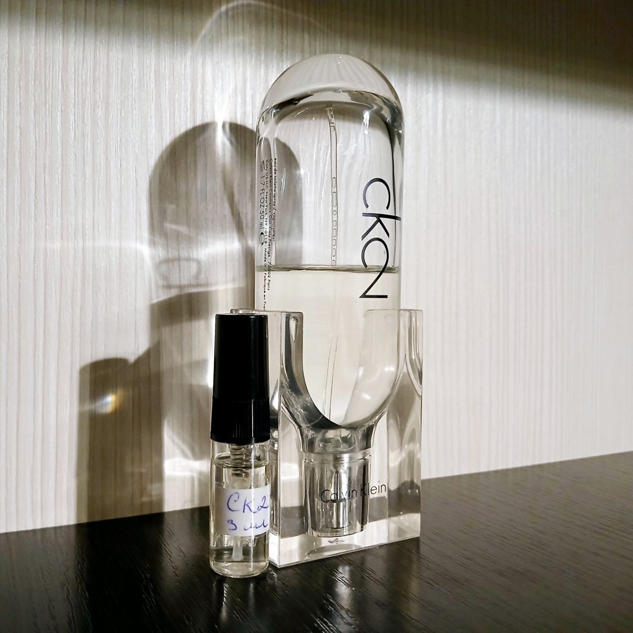 Calone в ck2 естественно принимает формы окружающих его аккордов. В его прохладной воде плавают сладкие розовые лепестки пиона и белых роз. Сок мандарина с сахарином выжат в эту воду вместе с зелеными листьями фиалки. Поверх освежающего цветочно-фруктового течения туманной дымкой наплывает теплая пудровая линия – от фиалки, сладкой грушевой мякоти и ириса к ладану и кумарину. Белый, чуть фруктовый мускус и древесно-минеральные материалы впитывают воду во влажном и чуть сладком пыльном шлейфе. Пронизывающие лучи гедиона увязают в этом сладковатом тумане. Общее впечатление от ck2 – предрассветные белые облака над водой, которые первыми розовеют от встречи с солнечными лучами. Еле ощутимая легкость, сладость, ватность.