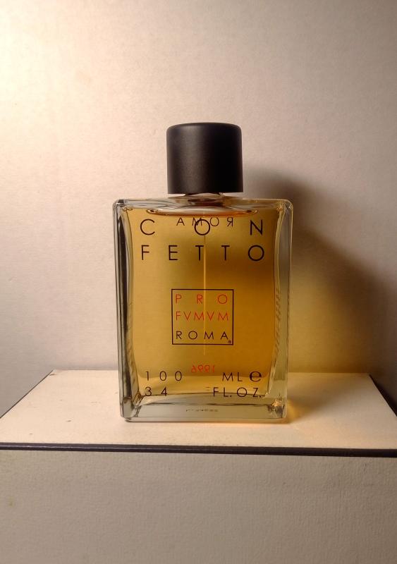 Confetto – унисексовый парфюм, который относится к линейке нишевых духов. Композиция принадлежит к группе цветочных ароматов. Была впервые презентована итальянским брендом Profumum Roma в 1996 году. Вдохновением для создания парфюмерного эликсира стала история одной женщины, которая умеет радоваться жизни беззаботно, отдавая любовь сполна. Она энергична в собственных действиях, решительна в жизненных целях и организованна в неожиданных судьбоносных поворотах. Ее полноценное удовольствие от жизненных моментов можно сравнить с ощущениями ребенка, которые искренны и правдивы. Аромат Confetto – это вкус веселья с приятными и драгоценными воспоминаниями. Парфюмеры бренда смогли заключить во флакон духи, ассоциирующие нежность, капризность, игривость и шалость. Тандем с цветочной композицией станет находкой для спонтанных и жизнерадостных натур, которые имеют оптимистические взгляды и ценят каждый миг. Звучание парфюма раскрывается с нот неповторимой сладкой амбры и пудровых аккордов мускуса, которые в дуэте придают эликсиру особого благородства, чувственности, эротизма и желанности. Связь с верхними оттенками прерывается монотонным пикантным нюансом засахаренного миндаля, который продолжает нести на коже традицию тепла и сладости. Он притягивает взгляды окружающих и согревает внутри, он на миг преобладает и отпускает, поскольку в права вступает пряный звездчатый анис. Основа духов покоряет освежающими нотами, которые переливаются на фоне цветочно-сладостной сердечной композиции.