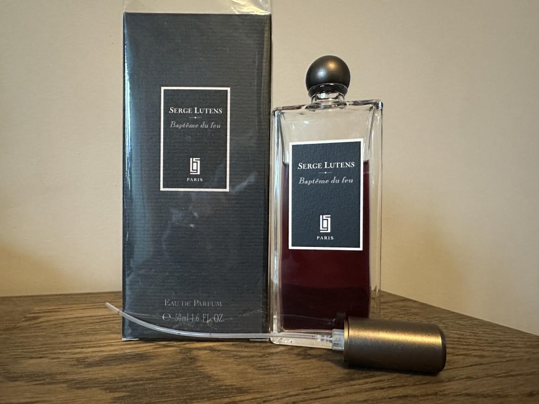 Глубокий красный цвет жидкости намекает на 'огненную' (или огнестрельную) природу, которую также подразумевают концентрические круги на плакате, сопровождающем новый релиз. Лютанс не был бы собой, если бы не прославился противоречивыми обрывками информации, попадающей в прессу перед каждым новым запуском, поэтому попытка анализа её - нелёгкая задача. Этот раз - не исключение: здесь говорится о стрельбе и запахе пороха, что одновременно является и "сладким наркотиком для носовой полости". То, что названо имбирным пряником, представляет собой пряную смесь ингредиентов, которые передают горячий вкус, и мы точно можем предположить, что новый аромат будет пряным, столь же пряным, как Five o' clock au gingembre (также построенный на аккорде имбиря), Vitriol d'Oeillet и Rousse. Есть также информация, что в аромате будут присутствавать ноты мандарина, османтуса, пудры и кастореума. На официальном сайте марки композиция Baptême du feu помещена в категорию гурманских ароматов вместе с Un Bois Vanille, Five o'clock au gingembre и Jeux de Peau.