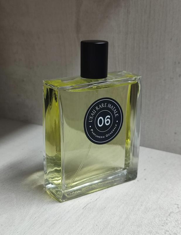 Начальные ноты аромата Parfumerie Generale PG06 L'eau Rare Matale рисуют картину утреннего чаепития, когда на столе мужчину ожидает чашечка любимого напитка, испускающего упоительный аромат благородного бергамота, с легкими пряными ароматами шалфея. Сердце аромата не заставляет себя долго ожидать и раскрывается ароматами черного чая, душистого перца и древесными нотами белого кедра. В шлейфе парфюма, переплетаются ароматы березы, которые сообщают композиции кожистые аккорды, обволакивающее тепло специй и благоухание ветивера.