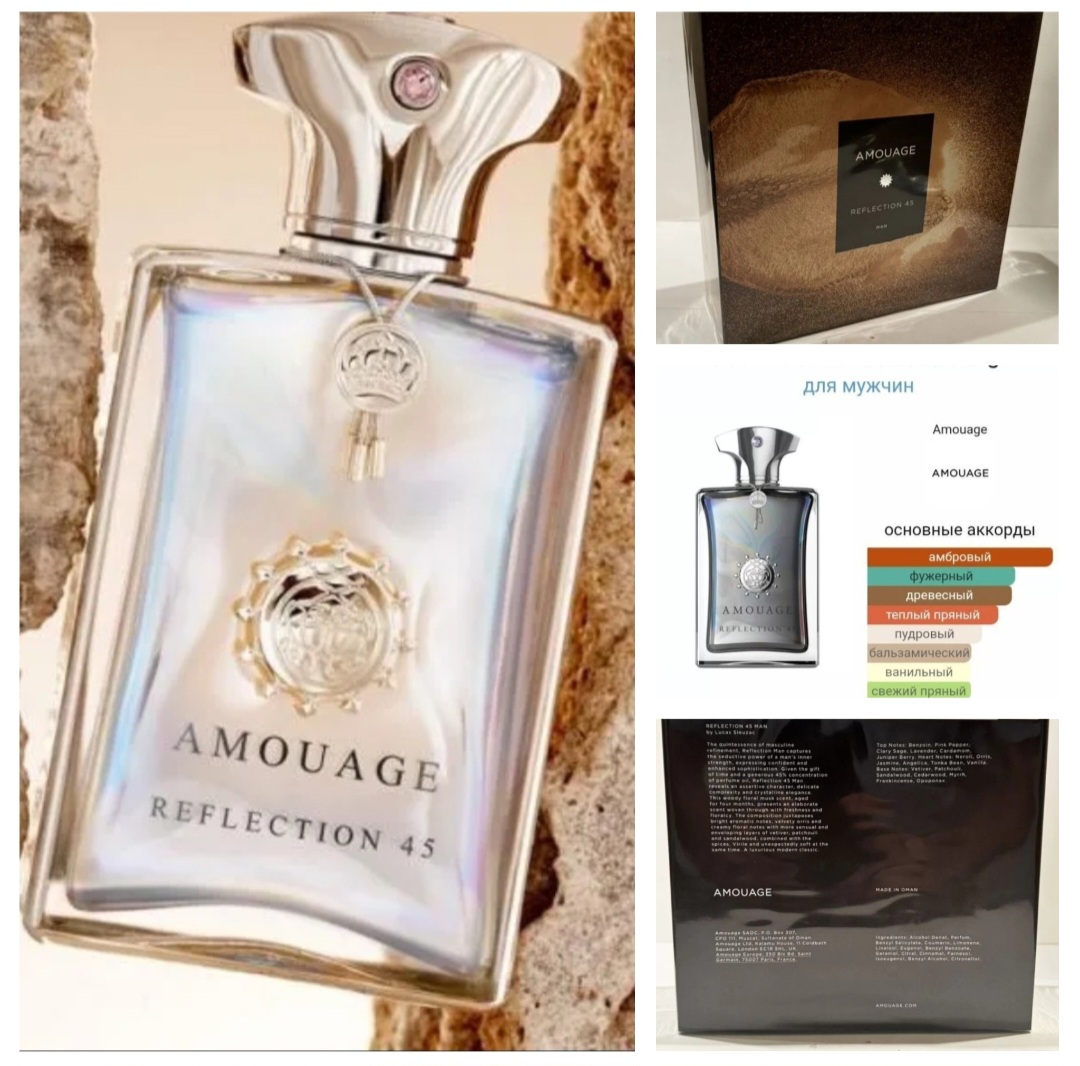 Amouage Reflection 45 — мужской древесно-цветочный мускусный аромат от парфюмера Lucas Sieuzac. Reflection Man 2007 года передаёт атмосферу барбершопа. Разработанный Лукасом Сьюзаком Reflection 45 Man - - это древесно-цветочно-мускусный аромат с четырёхмесячной выдержкой. Парфюмер взял исходную формулу и разделил её на отдельные составляющие: ароматическую, лавандовую и пудровую. В состав пудрового аккорда было введено несколько мускусов, кумарин и корень ириса, в результате чего он стал более богатым и многогранным. Ароматический аккорд, включающий множество душистых трав, пряностей и цитрусов, был дополнен корнем ангелики.