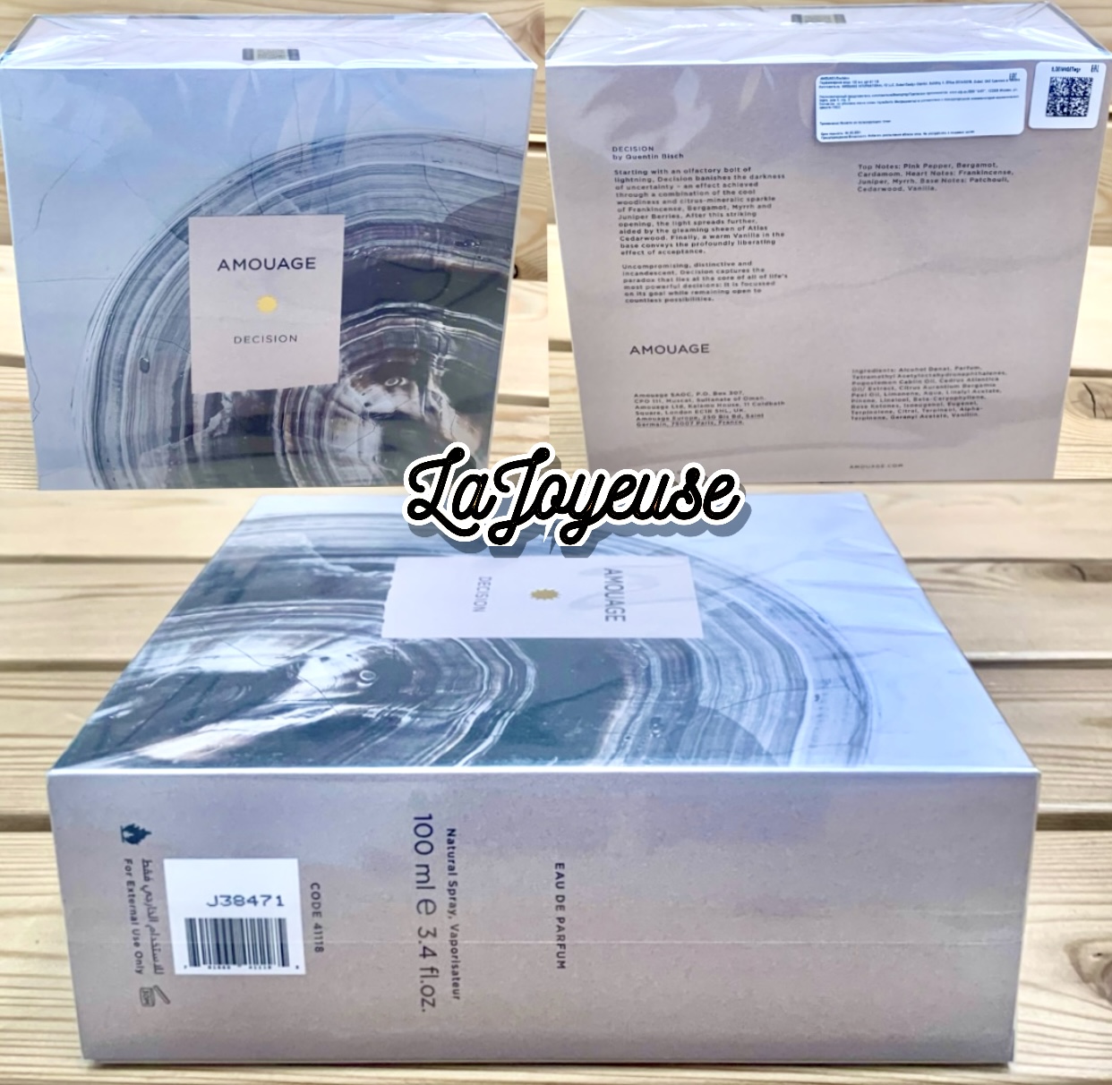 Сочетая в себе ноты бергамота, ягод можжевельника, ладана и мирры, Decision — это пронзительный аромат, рисующий картину окаменевших можжевеловых деревьев. В то время как первые ноты придают прохладный древесный оттенок, вторые придают свежесть и цитрусовую нотку. По мере раскрытия аромата в нём можно почувствовать атласское кедровое дерево и тёплую ваниль.