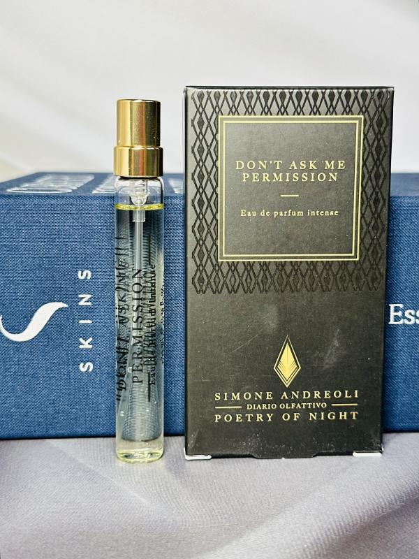 Раскрытие Simone Andreoli Don’t Ask Me Permission таково, что мы словно действительно слышим музыку и звуки танцев, голоса и смех людей. В тёплом воздухе ощущается запах сахара, сладкого апельсина, персиков, свежесть лайма и аромат бразильского ликёра качака, дополненного нотами маракуйи и традиционного коктейля кайпиринья. Ольфакторное путешествие продолжается пудровыми акцентами иланг-иланга и гелиотропа, мягкими интригующими древесными гранями сандала и серой амбры, завершаясь деликатным запахом белого мускуса.