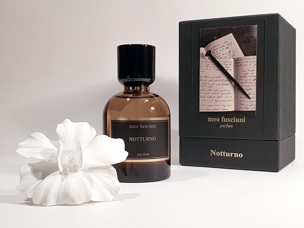 Главной темой новой парфюмерной работы Meo Fusciuni является поэзия. До сих пор поэзия всегда была главным спутником жизни этого сицилийского маэстро. Аромат Notturno включил в себя пять автобиографических поэтических моментов, воплотив в себе вдохновение творчеством постмодерниста Рильке, выдающегося немецкого поэта Фридриха Гёльдерлина, немецкого поэта-новатора Пауля Целана, чилийца Пабло Неруды и мексиканской поэтессы XVII века Хуаной Инес де ла Крус. Пять обонятельных и зрительных шагов, пять символов, пять моментов ночи. И только один цвет – черный. Очаровательный аромат Notturno также родился ночью. Ночь - время поэзии, время глубокого внутреннего исследования и самопознания. После первого яркого взрыва эмоций наступает чернота: привкус чернил и пьянящие фруктовые ноты, перезрелые и пряные. И вот тьма медленно рассеивается, принимая мягкие очертания, неясные формы, обрамленные темными кромками. Перед вашими глазами – мерцающий свет далекой звезды. Фруктовые интонации медленно соединяются с оттенками кожи и ладана, а в это время ваши глаза привыкают к темноте - и вы видите Notturno более четко.