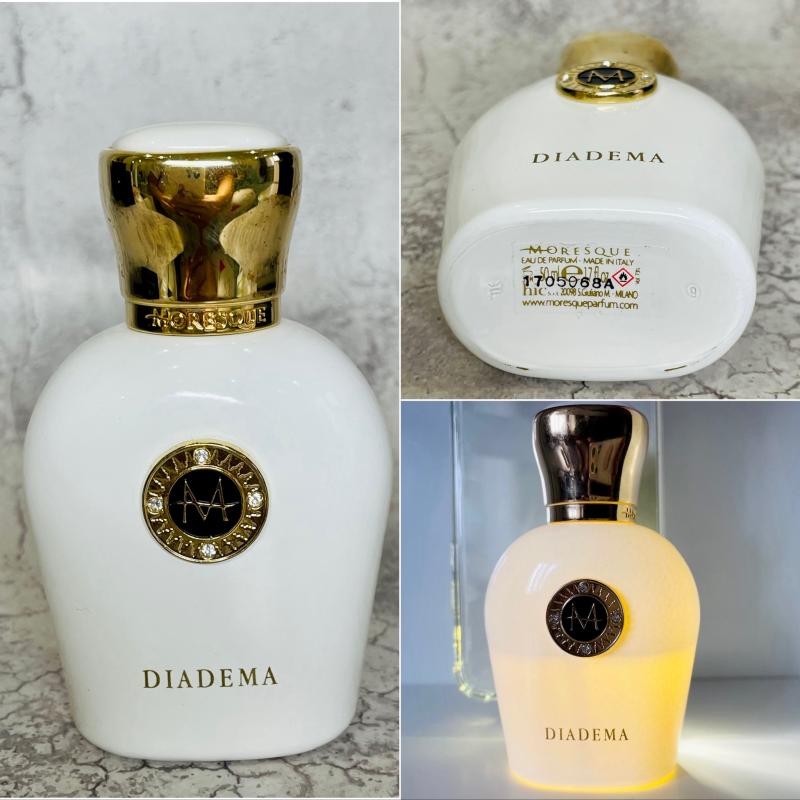 Moresque Diadema – изысканный и грациозный фруктово-цветочный унисекс парфюм с легкими гурманскими акцентами, выпущенный в 2015 году нишевым парфюмерным домом Moresque в рамках «Белой коллекции». Парфюм берет свое название от слова "диадема" - роскошного ювелирного украшения, являющегося отличительным символом суверенитета и дворянства. Этот обонятельный венец сладости и красоты в верхнем аккорде украшен вкусными фруктовыми нотами черешни, бергамота и апельсина. Украшением композиции является драгоценный цветочный аккорд из шелковисто-пряной розы и терпковато-медового жасмина, которые звучат в обрамлении сладострастного иланг-иланга. В то время как база композиции дарит очаровательный запах карамели, нежную сладость ванили и пряно-древесные акценты пачули с легким вкраплением смолистых ноток бензоина.